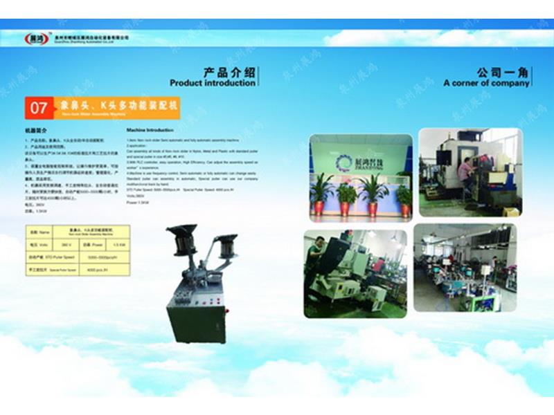 ??泉州市展鴻自動(dòng)化科技有限公司始創(chuàng)于2003年,是一個(gè)集研發(fā)、制造、銷(xiāo)售為一體的現(xiàn)代化公司,專業(yè)從事研發(fā)、生產(chǎn)各類(lèi)型號(hào)的全自動(dòng)拉鏈頭裝配機(jī)。泉州市展鴻自動(dòng)化科技有限公司始創(chuàng)于2003年,是一家集研發(fā)、生產(chǎn)、銷(xiāo)售、服務(wù)于一體的現(xiàn)代化拉鏈頭設(shè)備智能制造生產(chǎn)企業(yè):專業(yè)從事研發(fā)、生產(chǎn)各類(lèi)型號(hào)的全自動(dòng)拉鏈頭智能裝配機(jī)。亦可根據(jù)不同客戶的需求,提供適合客戶自身需要的“私人定制”式專用拉鏈頭設(shè)備及自動(dòng)檢測(cè)拉頭品質(zhì)一體機(jī)。泉州市展鴻自動(dòng)化科技有限公司始創(chuàng)于2003年,是一家集研發(fā)、生產(chǎn)、銷(xiāo)售、服務(wù)于一體的現(xiàn)代化拉鏈頭設(shè)備智能制造生產(chǎn)企業(yè):專業(yè)從事研發(fā)、生產(chǎn)各類(lèi)型號(hào)的全自動(dòng)拉鏈頭智能裝配機(jī)。亦可根據(jù)不同客戶的需求,提供適合客戶自身需要的“私人定制”式專用拉鏈頭設(shè)備及自動(dòng)檢測(cè)拉頭品質(zhì)一體機(jī)。